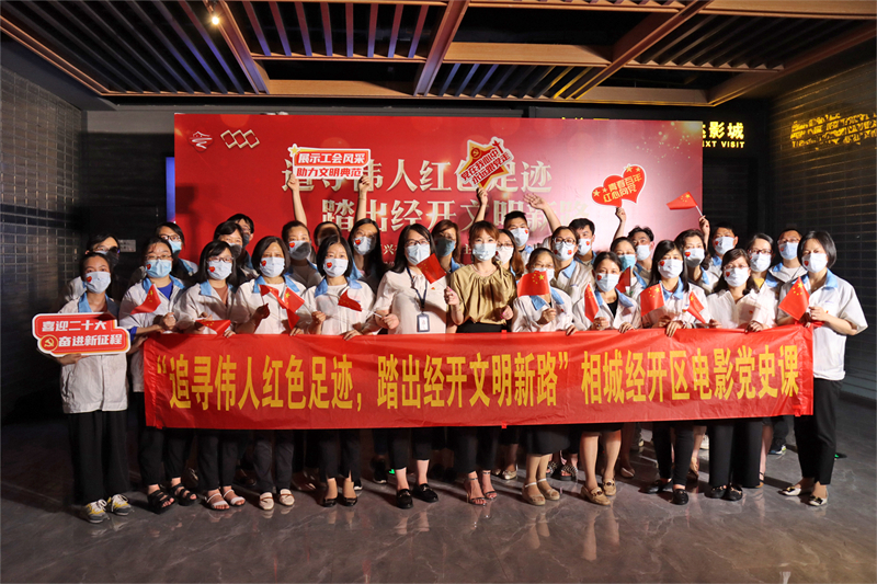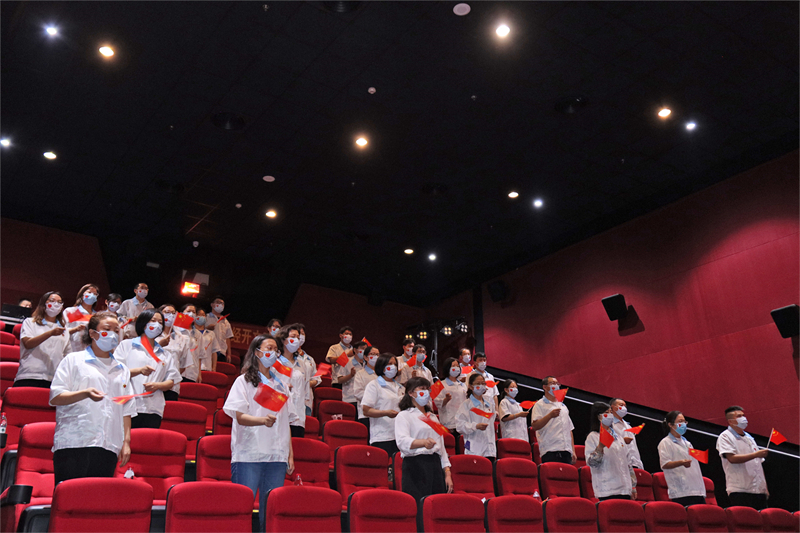 在電影開(kāi)始前,所有參加活動(dòng)的人員嚴(yán)肅起立,揮動(dòng)手中的小紅旗,共同唱響國(guó)歌,向偉大的祖國(guó)、偉大的中國(guó)共產(chǎn)黨表達(dá)忠誠(chéng)熱烈的愛(ài)。